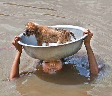 Cewek ini mengerahkan tenaganya untuk menyelamatkan anak anjing ini dari banjir.