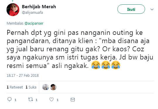 "Pernah dpt yg gini pas nanganin outing ke pangandaran, ditanya klien : "mba disana aja yg jual baru renang gitu gak? Or kaos? Coz saya ngakunya sm istri tugas kerja. Jd bw baju resmi semua" asli ngakak."
