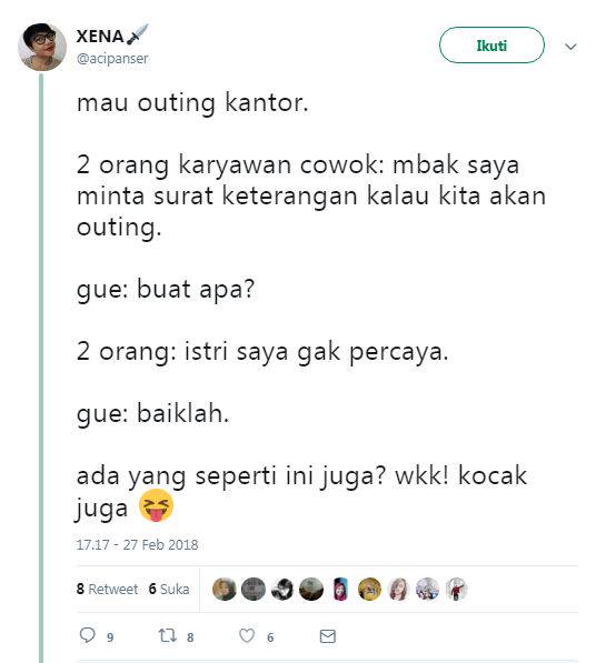 "mau outing kantor. 2 orang karyawan cowok: mbak saya minta surat keterangan kalau kita akan outing. gue: buat apa? 2 orang: istri saya gak percaya. gue: baiklah. ada yang seperti ini juga? wkk! kocak juga"