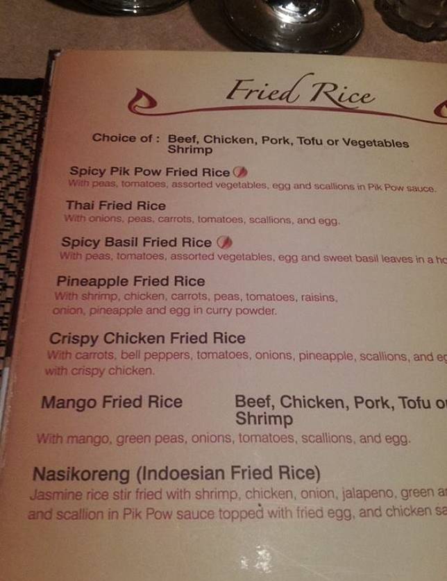 Ada nasi goreng Thailand, ada yang rasanya pedas, atau menggunakan buah-buahan, daging ayam krispi, daging sapi, atau aneka sea food.