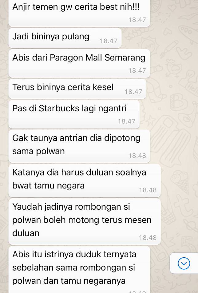 Chat tersebut berisi curhatan istri temannya ini lagi pergi ke sebuah kedai kopi ternama.